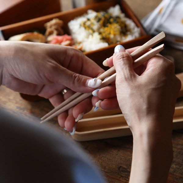 フタは、開け閉め・出し入れがしやすいかぶせ蓋で、同サイズのめいぼく箸がぴったりと収まります。曲げわっぱや木製のお弁当箱に良く似合います。