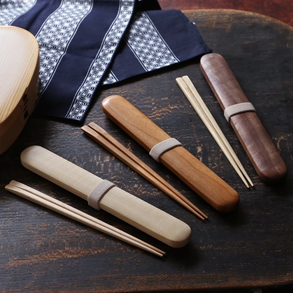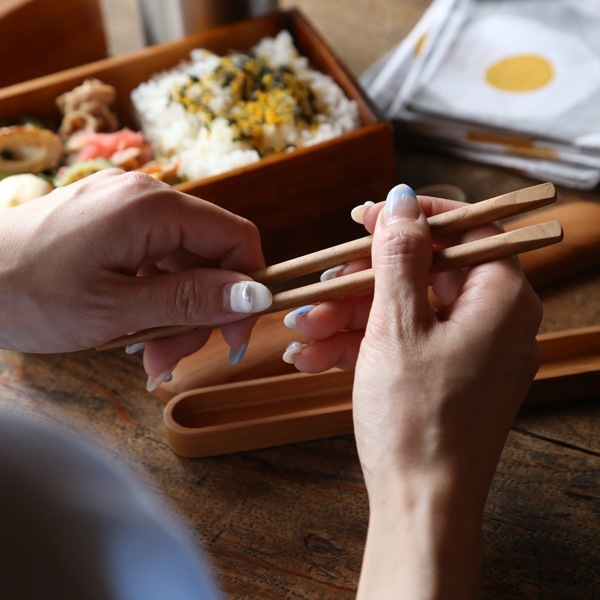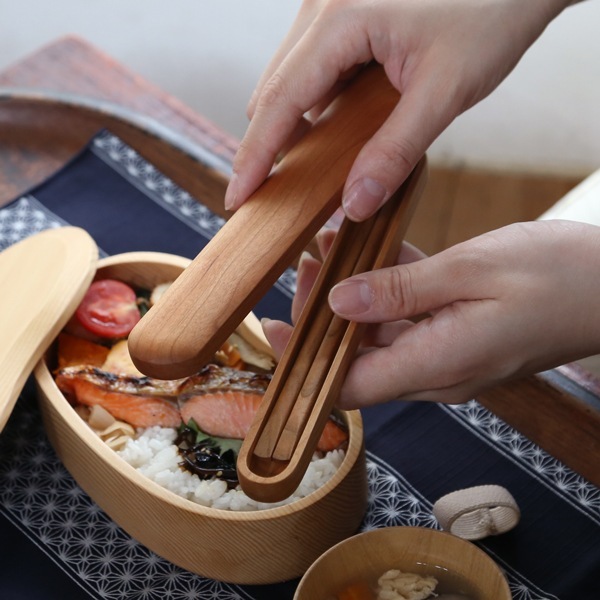 フタは、開け閉め・出し入れがしやすいかぶせ蓋で、同サイズのめいぼく箸がぴったりと収まります。曲げわっぱや木製のお弁当箱に良く似合います。