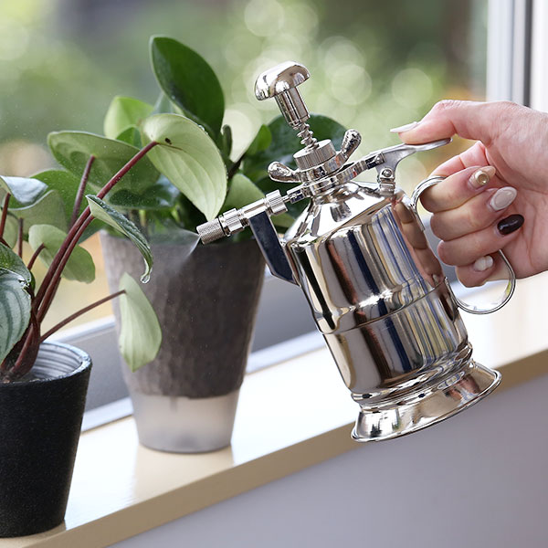 こちらの霧吹きは、タンク内に空気を入れて使う加圧式のもの。レバーを引いたままにすると水が出つづけ、スプレー缶のようにお使いいただけます。何度もトリガーを引かなくても良いので、手が疲れないということに加え、霧吹きを使うのが楽しいと感じるように。