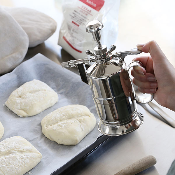 霧吹きから出る細かい水の粒は、生地の表面に均一に掛けることができます。焼いている間、パンの表面に水分があることで生地がよく伸びて、きれいに膨らみやすくしてくれます。