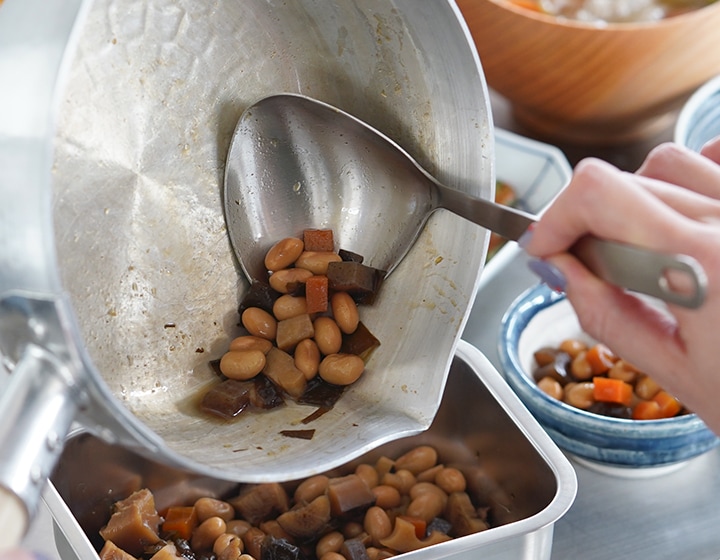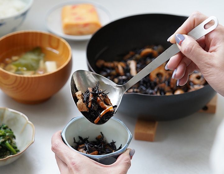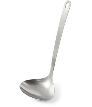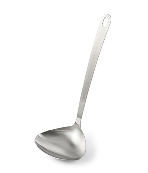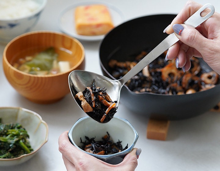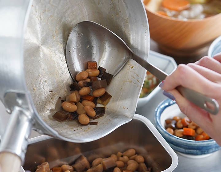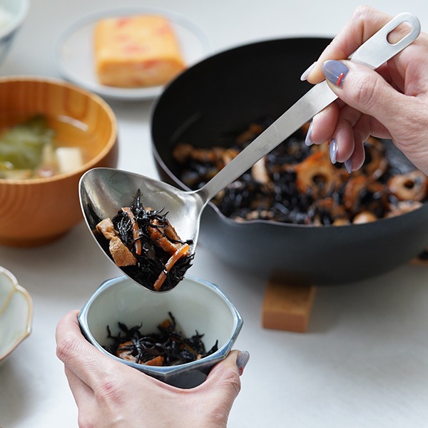鍋底や鍋肌にあうハマグリ型で具材を寄せ集めやすいお玉。皿部分の手前側が鍋の側面や底面にフィットするので、寄せてかき集めやすいです。 容量は35mlで、卓上で煮豆などをすくったり、小鉢の盛り付けやスープジャーへ注ぐときにも便利。
