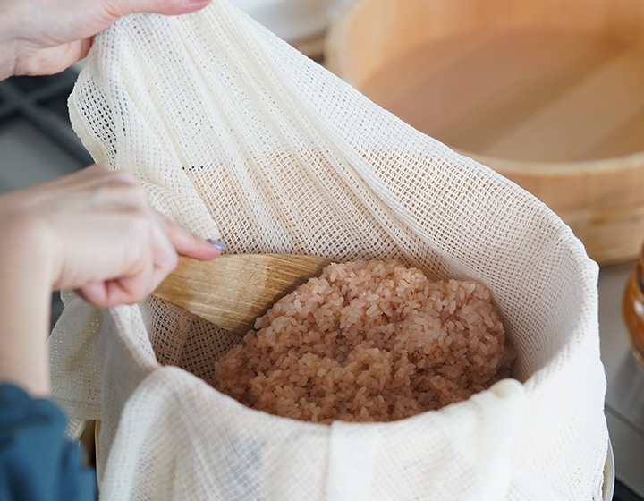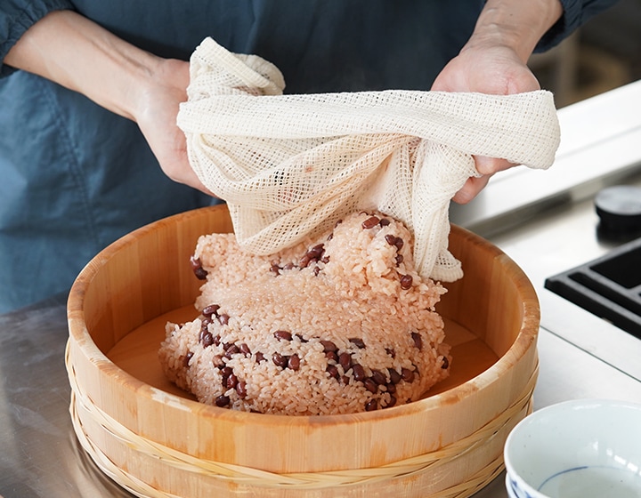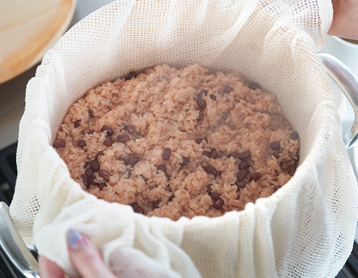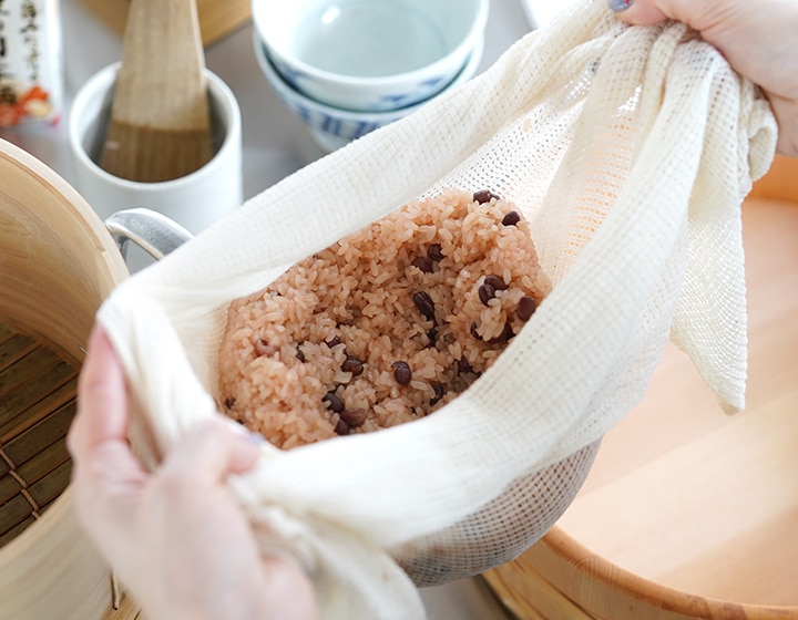 お赤飯やおこわなど、途中でもち米を返す時も蒸し布ごと取り出すことができるので作業が捗ります。