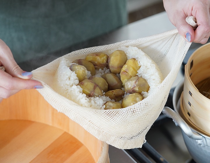 Mサイズ お赤飯やおこわなど、途中でもち米を返す時も蒸し布ごと取り出すことができるので作業が捗ります。
