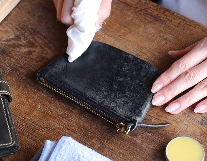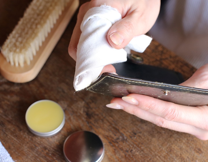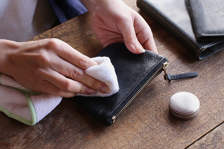 乾いたら、仕上げ用のやわらかい布で乾拭きをします。余分なクリームを拭き取ったら、メンテナンス完了です。クリームの塗布後は水や汚れを弾き、自然なツヤに仕上がります。