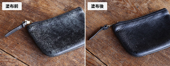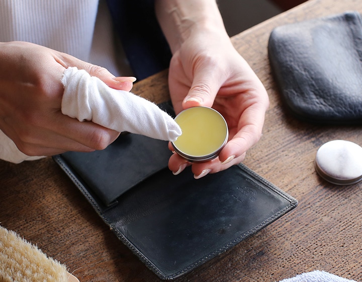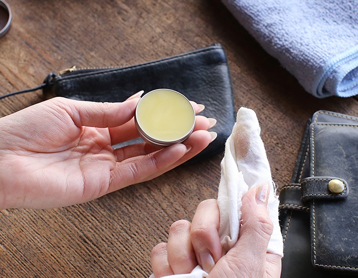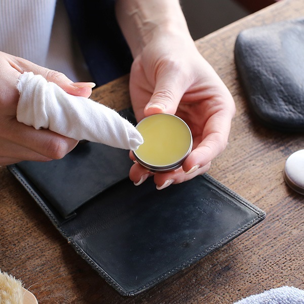 乾いた布やきれいな指に少量のクリームをつけ、なじませるように薄く塗ります。若干濡れ色に仕上がるため、初めて使う場合は目立たない所で試し塗りをしてください。