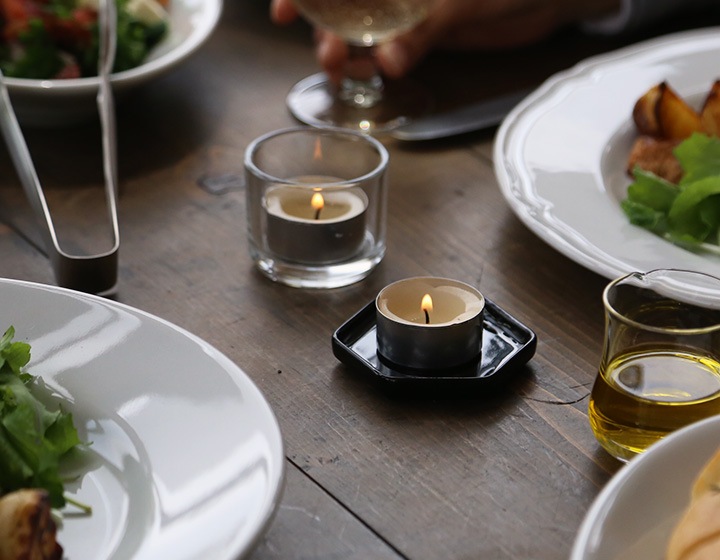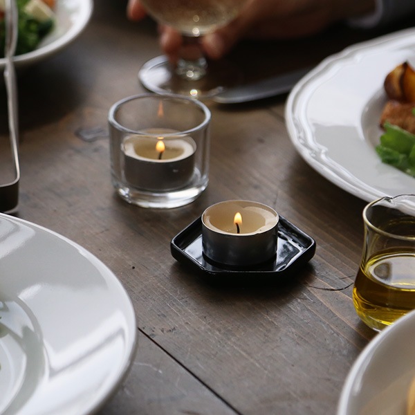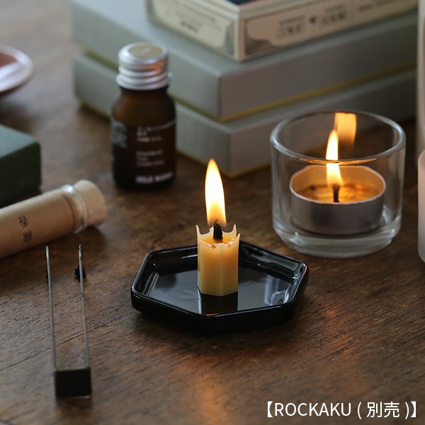 艶のある黒色の釉薬で仕上げられ、ROCKAKUの黄色い蝋がよく映える色合い。さまざまな形のろうそくに合わせやすい、シンプルな風合いを持っています。