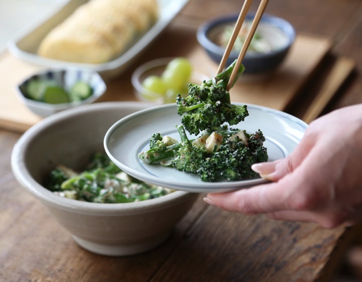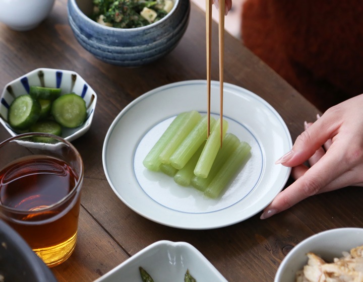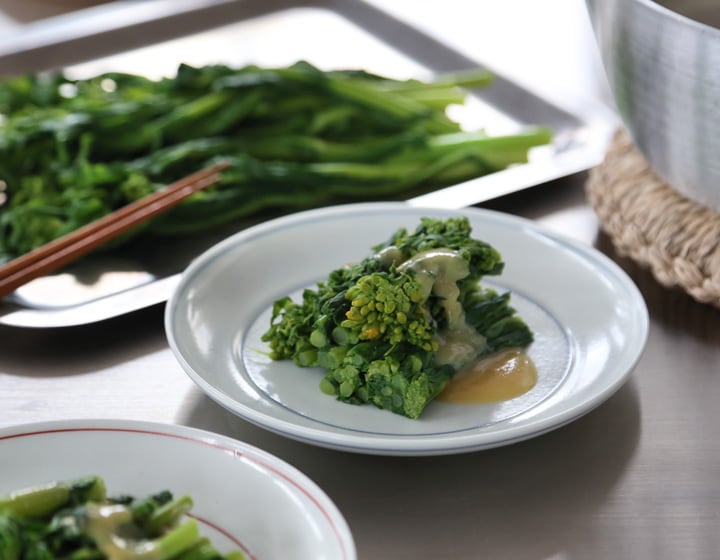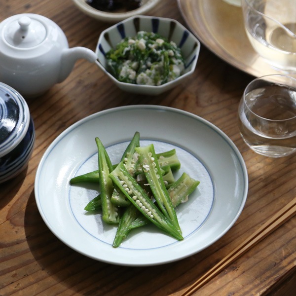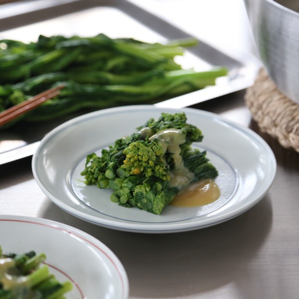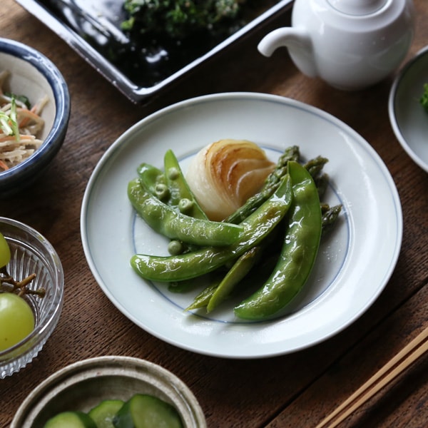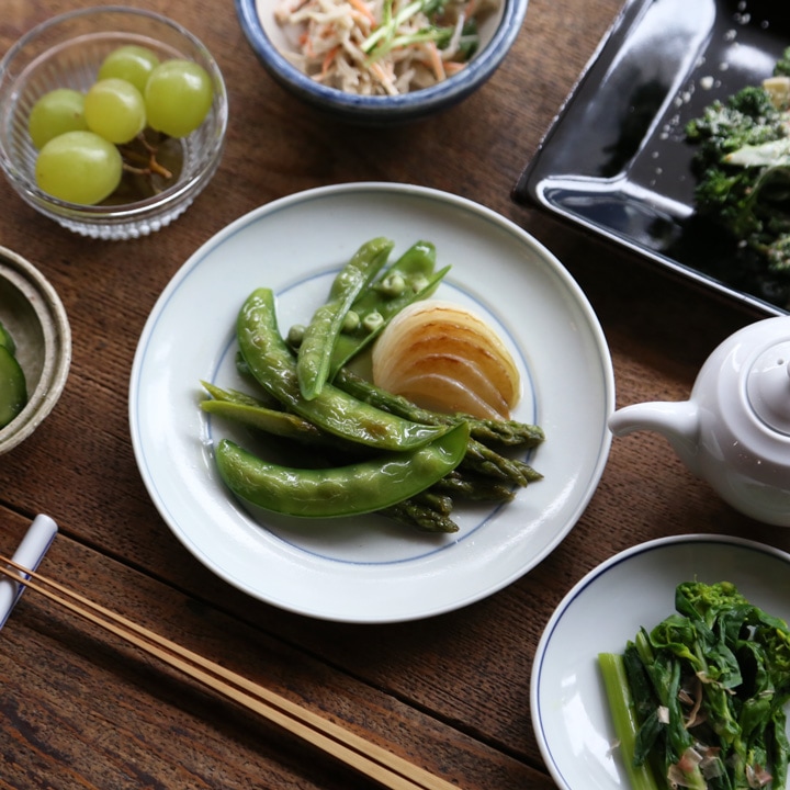 落ち着いた青の輪線が上品な雰囲気。菜の花やほうれん草、スナップエンドウなど生き生きとした新緑が引き立つ一枚。取り皿として何枚あっても勝手のいいお皿です。