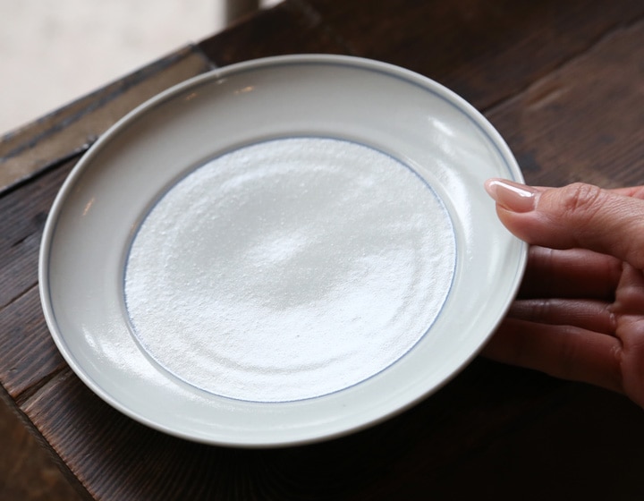 うつわの見込みの丸く凹んで落ちた部分は「鏡」と呼ばれ、このお皿には、大きな鏡があるので名前は「丸鏡」。 縁起の良い「赤輪」に続き、青い線の「呉須輪」が加わりました。