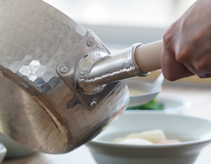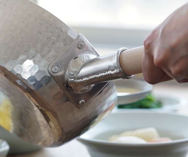 底面の角が丸く胴が上に広がっているので液体が対流しやすく、煮物はもちろん、味噌汁やスープ作り、麺や食材を茹でたり、出汁取りなど幅広く活躍します。(7寸) 姫野さんが特に大事にしているのが鍋底の角の部分。熱を受けて上へ伝える部分と、一番衝撃が加わる所なので、この僅か1cmほどの曲面に4段槌目を入れて充分に叩き締めます。