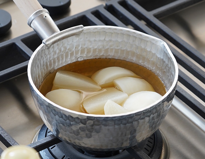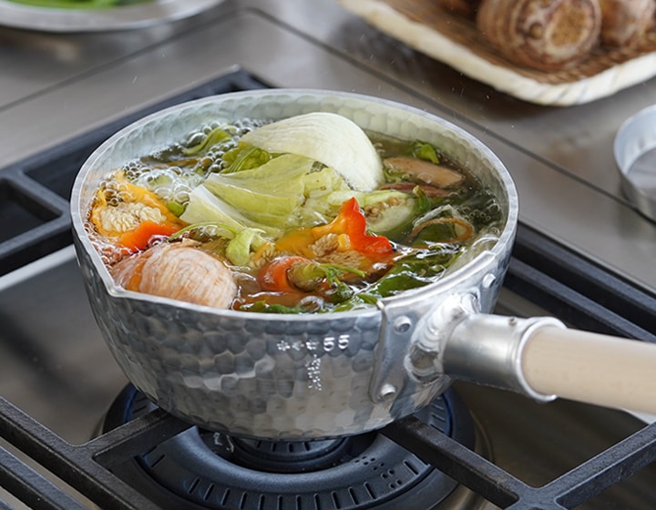 熱伝導に優れ、軽くて扱いやすいアルミ行平鍋は、日本料理を作るうえで欠かせない存在。料理人や一般家庭でも重宝される料理の基本とも言える片手鍋です。