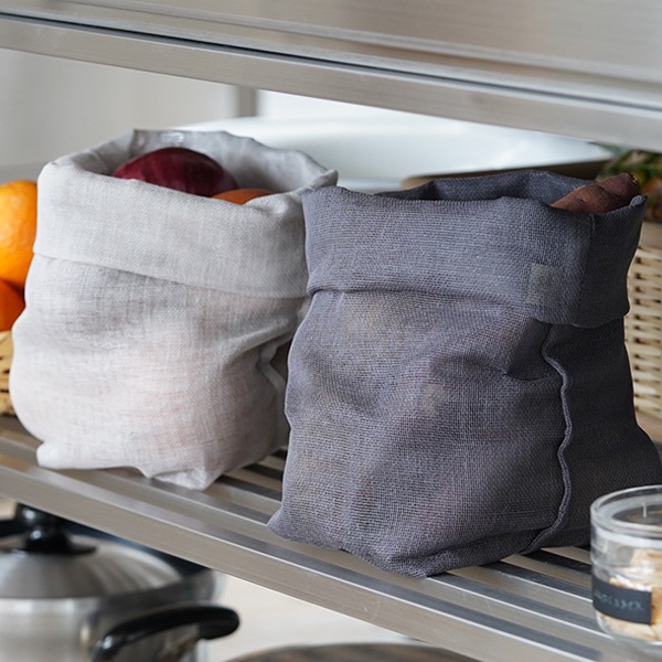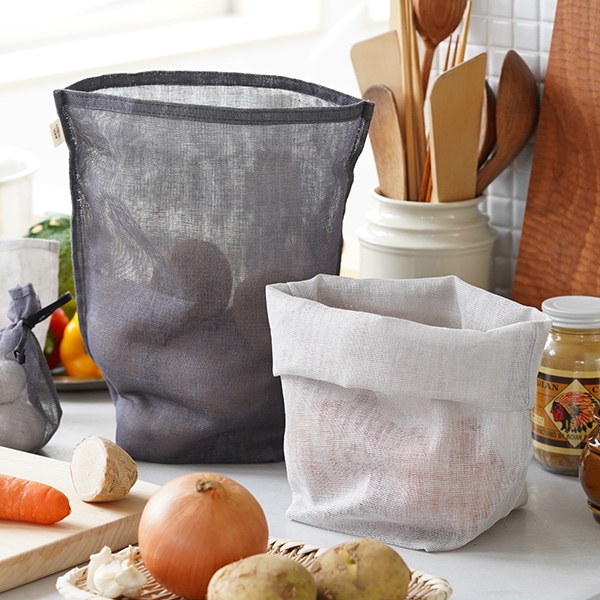 手前:銀ねず/奥:つるばみ 奈良の地場産業である蚊帳生地で作られたシンプルな野菜袋。粗目で通気性に優れた蚊帳生地の特徴を生かした野菜保管用の袋は、「風は通すが蚊は通さない」と言われる蚊帳ならではのアイテムです。