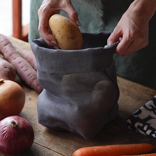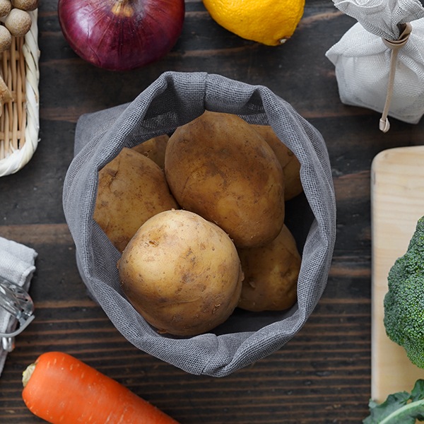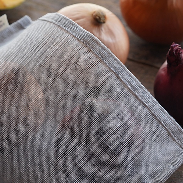 衣類から布巾など、蚊帳生地のアイテムは様々ですが、用途によって重ねが異なります。ちょっと重量のあるじゃがいもや玉ねぎを入れたい「野菜袋L」は、通気性に丈夫さをプラスした二重仕立てになっています。蚊帳(かや)生地とは