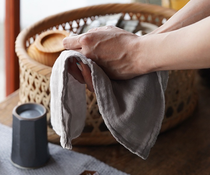 銀ねず 棉ふきん・お台ふきのいいとこどりの「お手ふき」。3重でしっかり水分をとってくれるので、ハンドタオルとしてはもちろん、37cm角の大きさは、お茶碗や小皿、カトラリーなどを拭くミニふきんとして使ったり、折り畳んで台ふきとしても活躍します。