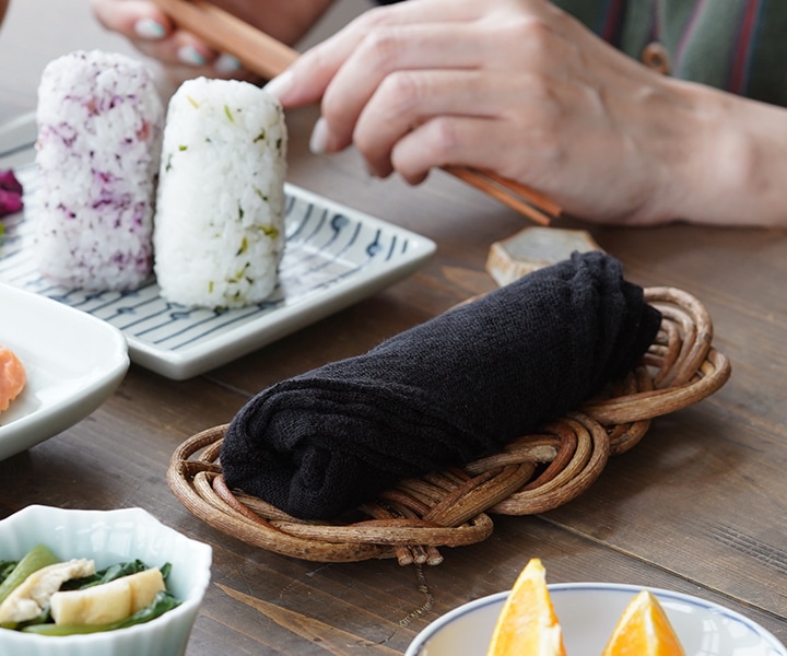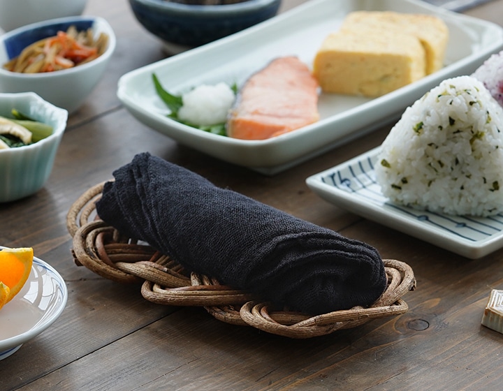 墨 織り目の粗い、風通しの良い蚊帳生地は、「風は通すが蚊は通さない」と言われ、空気を通すために糸と糸の間を広くとって織り上げています。生地の間にしっかりと水分を吸収し、程よい目の粗さから生まれる通気性の高さは、乾きやすく清潔を保つことができます。