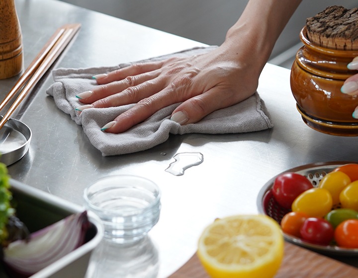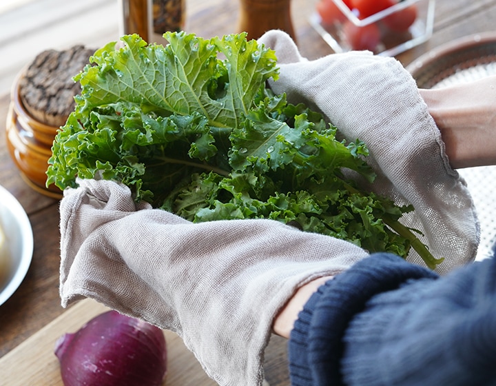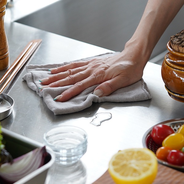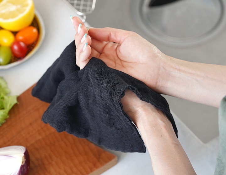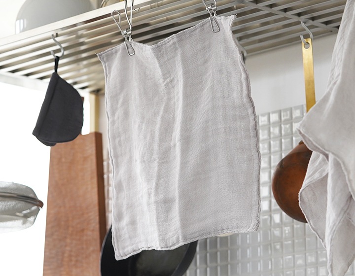 吸水、速乾、通気性、肌触りに優れた「かやお手ふき」は、水仕事でさっと手を拭く時に丁度良いサイズ感。水分をすばやく吸水し、すぐ乾き、嫌なにおいがつきにくく衛生的。熱にも強く丈夫です。