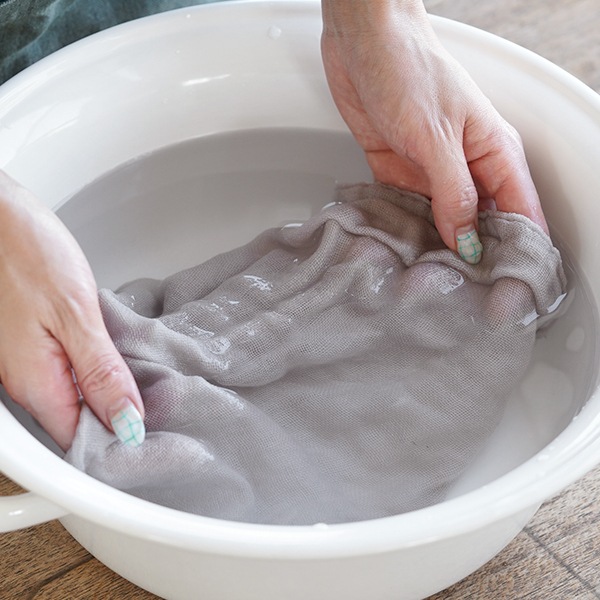 使い始めは、洗い桶や洗面器に40℃くらいのお湯を溜め、お湯が濁らなくなるまでやさしく押し洗いして糊を落としてからご使用ください。