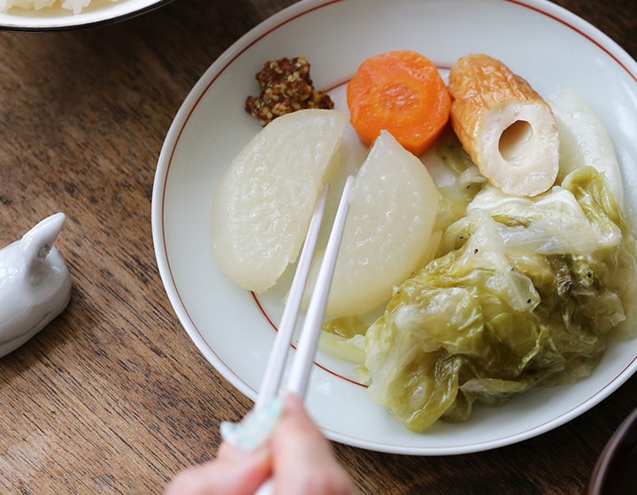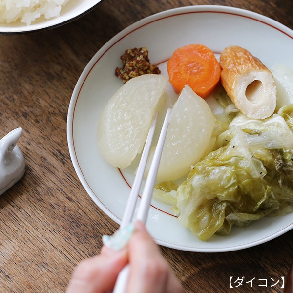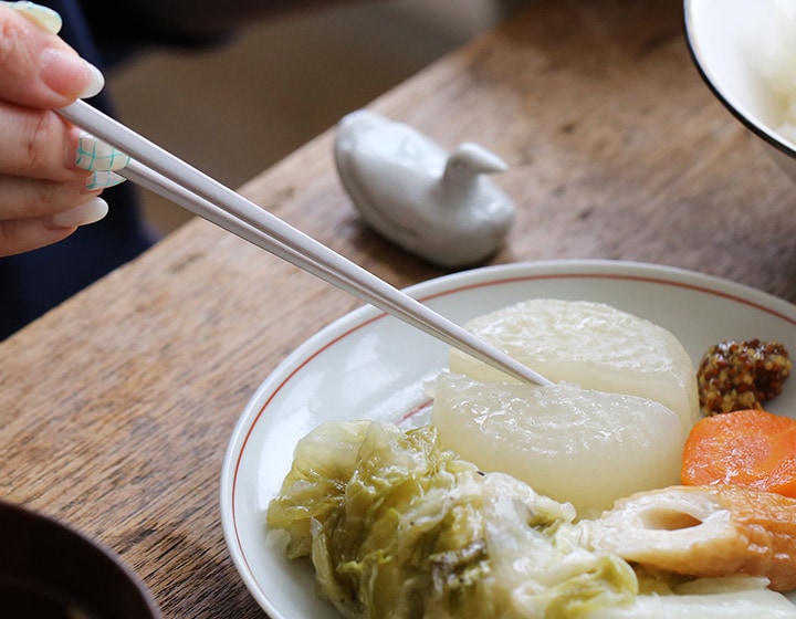 洋風おでん 【ダイコン】 ヤマチクが作るお箸は国産の竹でできており、とても軽く、しなやかで丈夫。丈夫ゆえに加工が難しい竹を、一膳ずつ手作業で作り上げています。