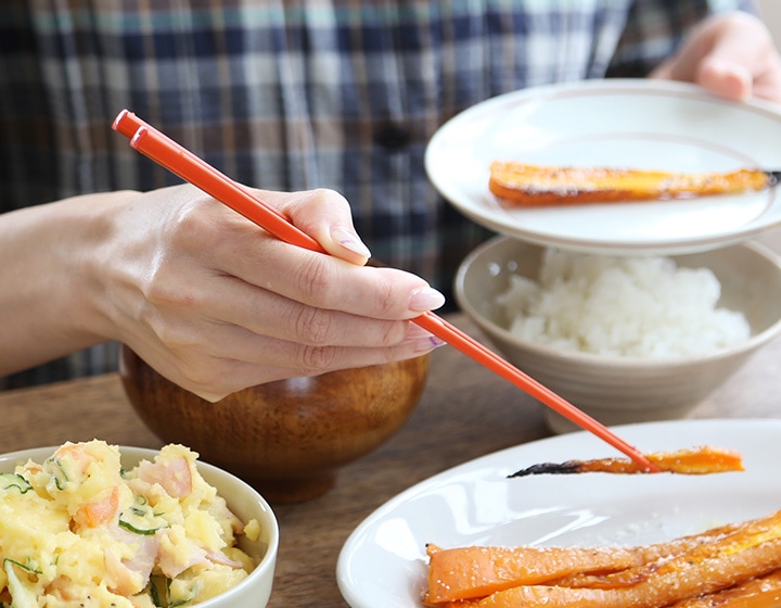 やや透け感のあるお箸は竹の風合いを残しつつ、野菜についた土っぽさを表現。なんだか野菜が食べたくなるような色合いです。