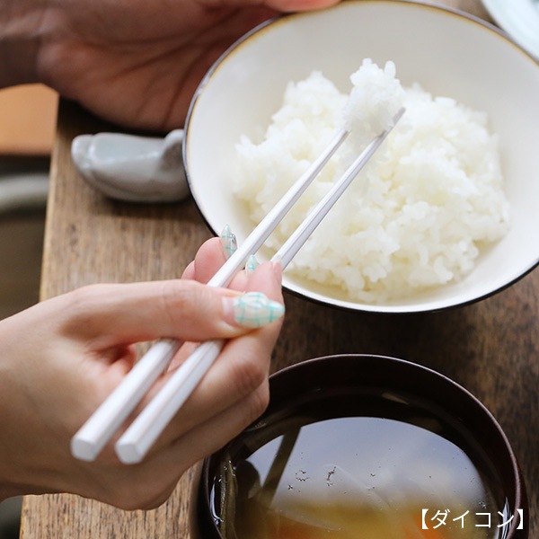 表面は野菜のようにややマットで、土っぽさを感じる下地が透けた風合い。すべすべとした手触りも良く、持った心地が良いお箸です。
