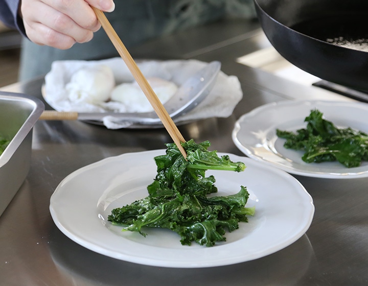 透け感のある菜箸は竹の風合いを残しつつ、野菜についた土っぽさを表現。持ち手先は野菜のヘタや葉を思わせる緑色をしており、新鮮な野菜のような色合いです。