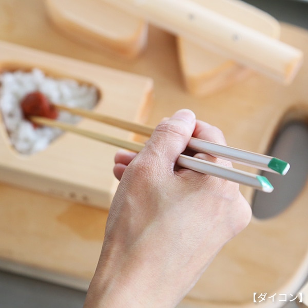 表面は野菜のようにややマットで、土っぽさを感じる下地が透けた風合い。すべすべとした手触りも良く、持った心地が良い菜箸です。