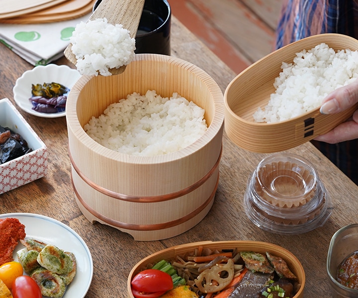 夜に炊いたご飯を、翌朝までお櫃に入れておいても美味しくいただくことができます。炊飯器のようにご飯が硬くならないので、お弁当に使うのもオススメです。ツヤのある美しい木肌