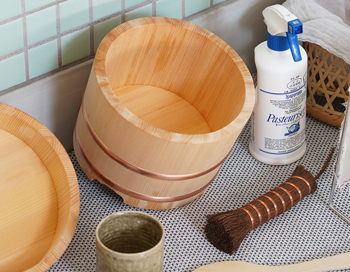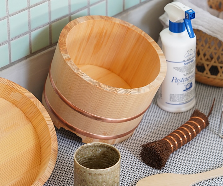 洗った後に、桶の内側と木口(木の切口面)に消毒用アルコール(エタノール)を霧吹きすると、黒ずみやカビの発生を抑えます。木ヤニについて