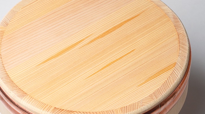 お櫃や寿司桶に使われている木曽さわらは、木目同士の幅が狭く並行に並んでいる柾目材と言う木材。均等に水分を吸収して放湿してくれるので、中に入れたご飯の水分を吸収しつつ逃しません。