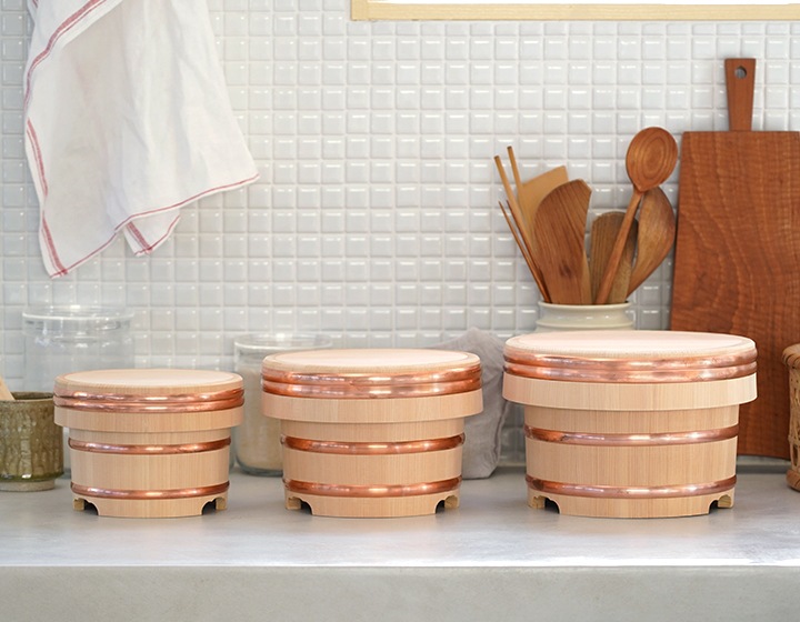 ツヤのある木肌と銅のタガで締められた昔ながらの江戸びつ。使用するうちに銅の色が味わい深く変化し、趣のある佇まいはキッチンで見せたくなる暮らしの道具です。お手入れについて