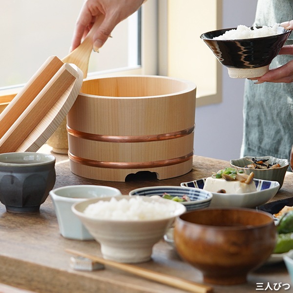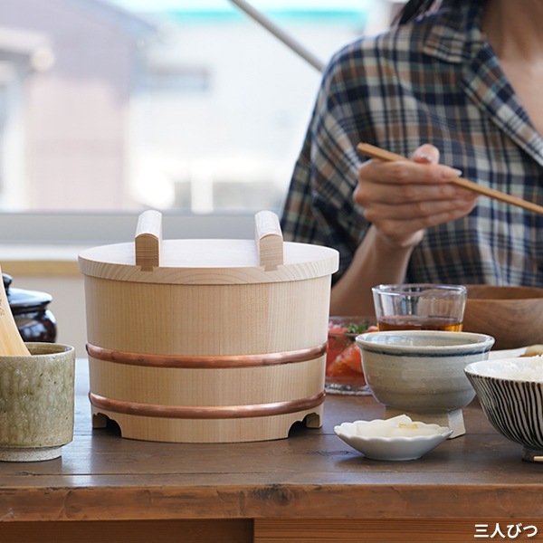 一人びつ・二人びつ・三人びつは、関西地方で使われてきた「のせ蓋おひつ」や「地びつ」と呼ばれる伝統的な形のお櫃。取っ手がついた木の板を乗せるだけのシンプルなデザインが特徴で、忙しい時でも片手で簡単に蓋の開閉ができます。