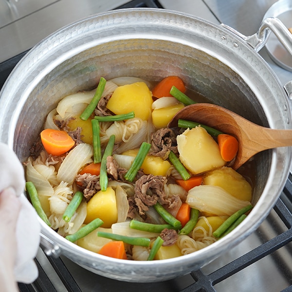 日本料理店においては行平鍋と併せて使用することで、8割以上の料理をまかなえると言われるほど大切な存在です。熱伝導に優れ、軽くて扱いやすく、内側に段が付いている日本独自の形状は、蓋をしても吹きこぼれにくく、おでんやシチューなどじっくりコトコト煮込む料理に最適です。