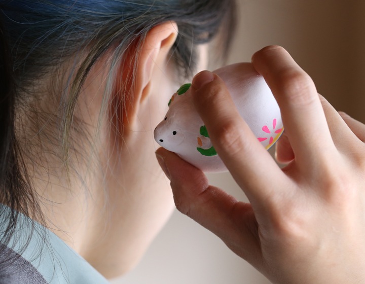 息を吹き入れると「ホーホー」と音が鳴る土笛や、振ると音が鳴る土鈴など、尾崎人形には子どもが喜ぶ仕掛けがたくさん。