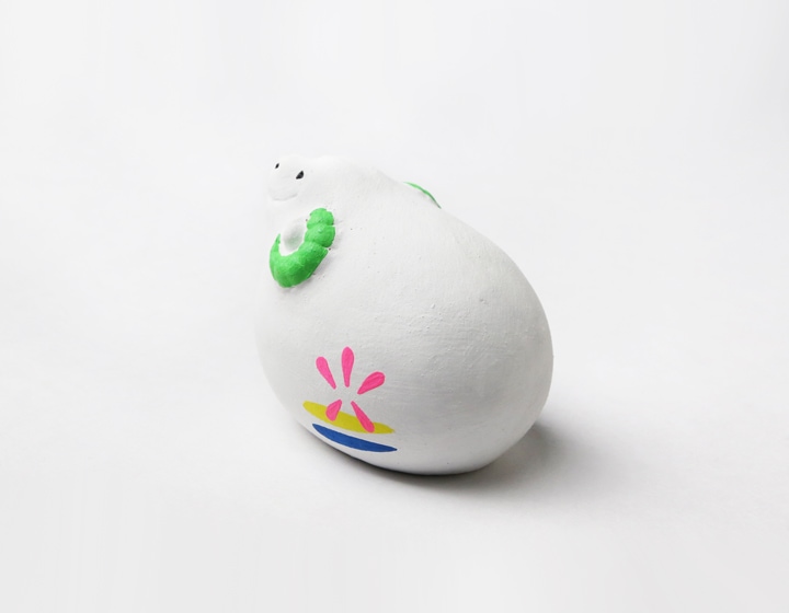 白を基調に赤や青、緑などの鮮やかな色で着色しデザインされ、独特のユルさ・脱力感がなんともいえず、その愛嬌のある表情に心が和みます。