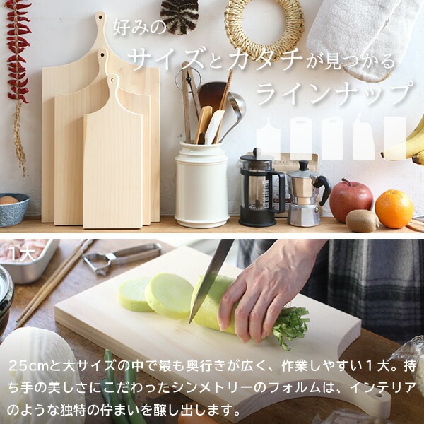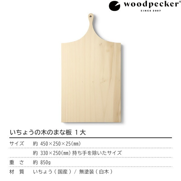 サイズ:約450×250×25mm/持ち手を除いたサイズ:約330×250×25mm / 重量:約850g / 素材:いちょう(国産) / 製造:woodpecker(岐阜県本巣郡)
