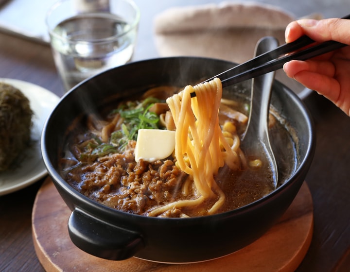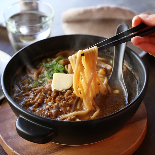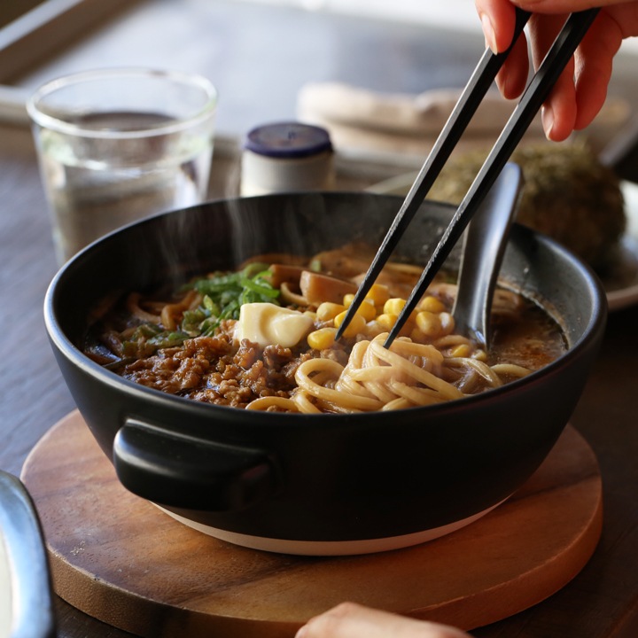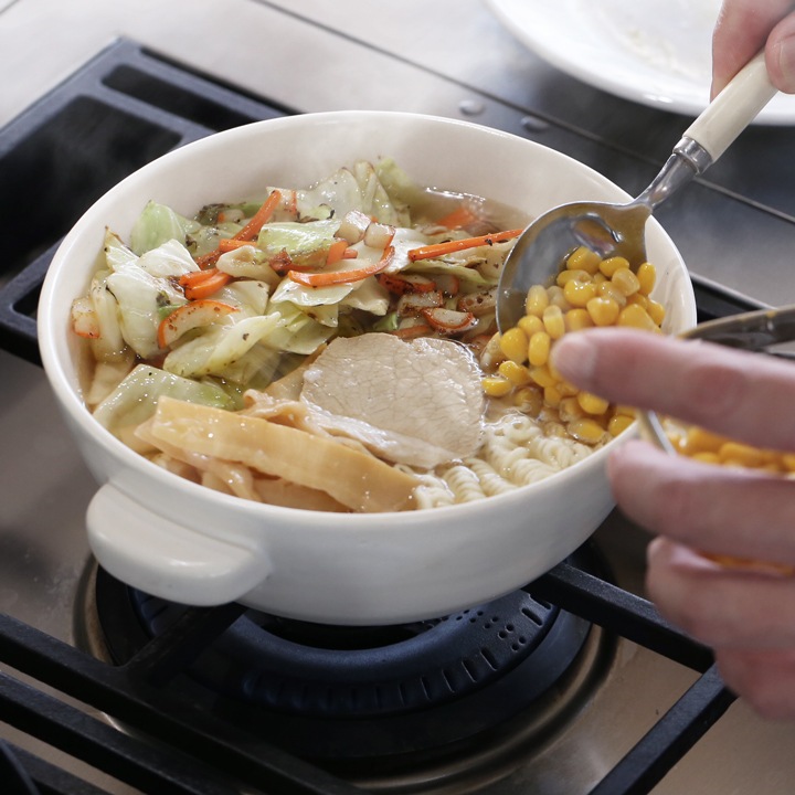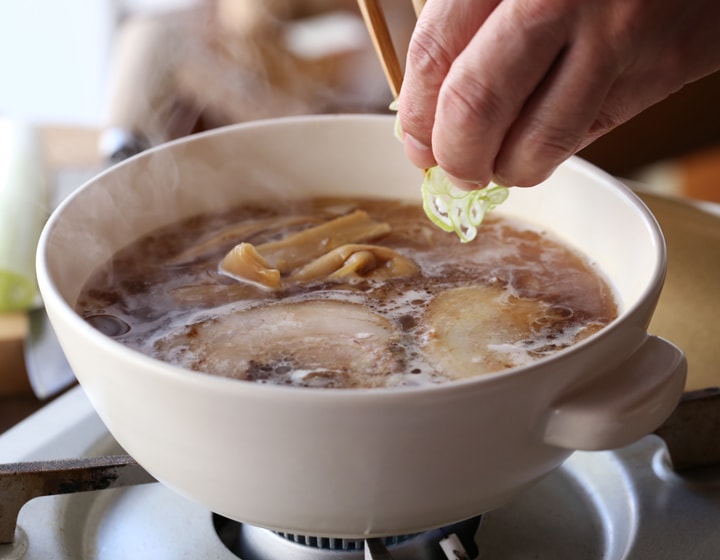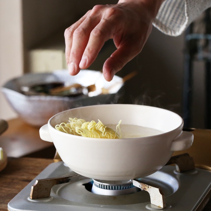 ガスコンロの火にかけ、ラーメンを作ったらそのまま食卓へ。陶器のうつわは蓄熱性に優れているので、熱々のラーメンを楽しむことができます。