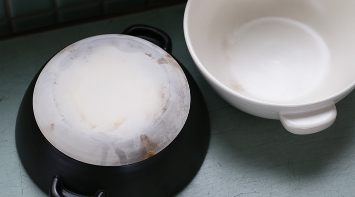 火が直接あたる底面は素焼きのため、火にかけることで黒く変色していきます。また内側も輻射熱で黒く変色します。 これらの変色は落とすことは難しいため、素焼きの魅力として、経年変化を楽しんでいただけると幸いです。
