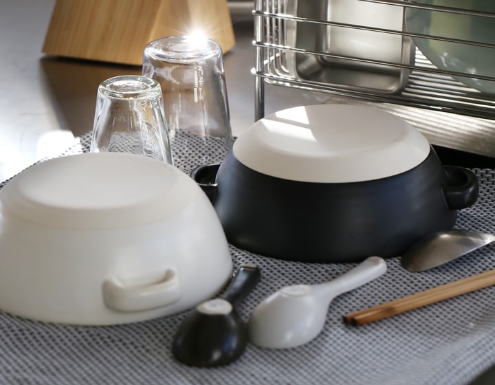 カラーは、柔らかな印象の白とお料理が引き締まる黒の2種類。どちらも味わいのあるマットな風合いが可愛らしいお鍋です。