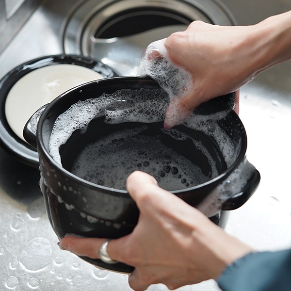 炊飯器のように、フッ素樹脂製の釜や内蓋、ゴム部分などのパーツや細かい隙間に傷がつかないようにスポンジで丁寧に洗わずとも、土鍋と蓋さえ洗えばいいのでサッと洗い物が終わります。基本的に表面は丈夫なので、柔らかめの棕櫚束子なども使えしっかり洗うことができます。ごはんの鍋 3合