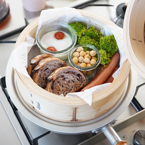 持ち手が干渉しなければ一回り小さな鍋にのせることもできます。せいろや蒸し板に対して小さすぎる鍋は倒れてしまうおそれがあるので避けましょう。