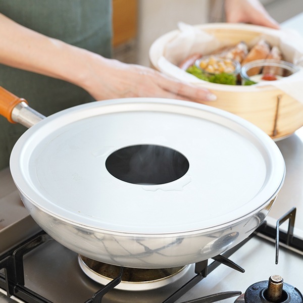 28cmの炒め鍋に蒸し板27をセットし、せいろ24で調理 せいろは蒸気の上がる鍋にのせるだけで簡単に調理できますが、せいろと鍋のサイズが合わなかったり、注ぎ口のある鍋では蒸気が漏れてうまく蒸すことができません。せいろがピタリとはまるせいろ用の鍋もありますが、もし、ご自宅にせいろピッタリの鍋が無い場合は、蒸し板を使うと便利。