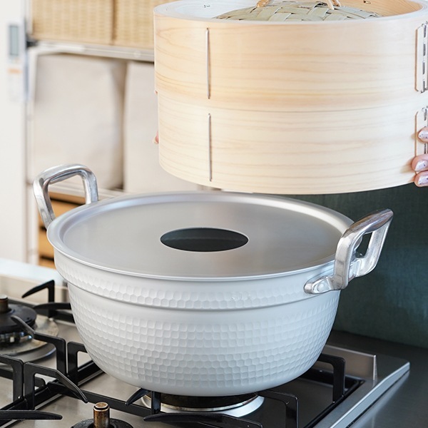 持ち手が干渉しなければ一回り小さな鍋にのせることもできます。せいろや蒸し板に対して小さすぎる鍋は倒れてしまうおそれがあるので避けましょう。