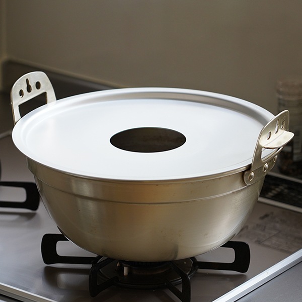 30cmほどの大き目のお鍋を使用しています。27と30の蒸し板にピッタリのアルミ鍋も2サイズご用意しております。