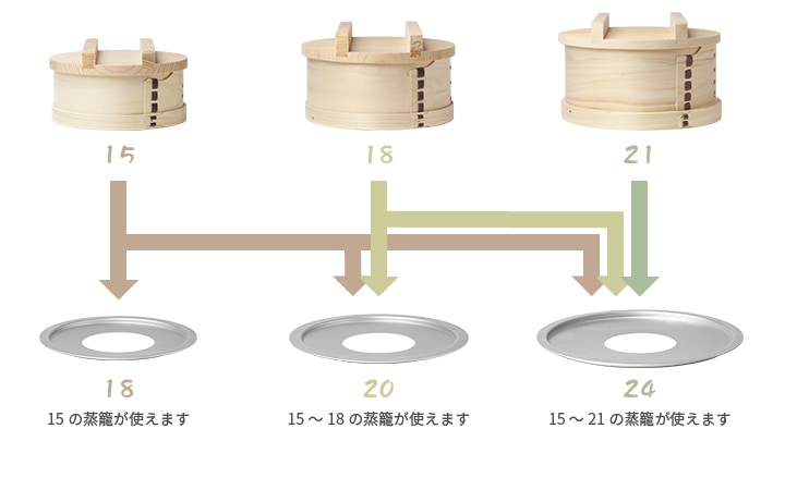 ※蒸し板が合わない鍋もあるのでご確認ください 鍋とせいろの間に蒸し板を挟めば、安定してせいろを鍋の上にセットすることができ、お手持ちの鍋で楽しむことができます。 ミニ和せいろに合う蒸し板を選ぶ際には、1サイズ大きいものをお選びください。18のせいろであれば20の蒸し板が合います。