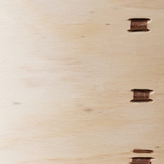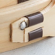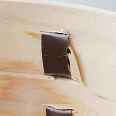 曲げ板の留め部分は、木の繊維に切り込みを入れ、桜皮か合成樹脂材で綴じています。そのため、曲げ板の木目の位置や木の繊維の方向により、止むを得ず留め部分の板にヒビ割れが発生する場合があります。