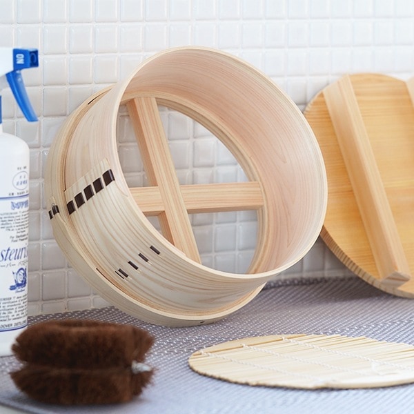使用前は、せいろが焦げるのを防ぐため水かぬるま湯に10分ほど浸し、木に充分水を含ませてください。