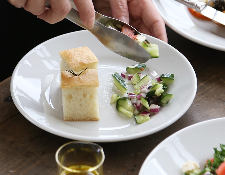 ほんのり色味がかった白磁のお皿は、お料理を引き立てやすい色合い。広いリムは余白を持たせ、盛り付けの幅を広げてくれます。安定感のある重さと厚みがあり、多少ガチャガチャと扱っても心配のないタフさがあります。