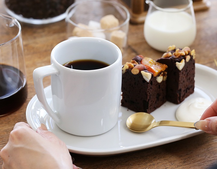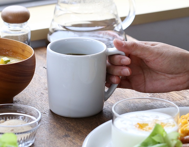 白い釉薬とつるりとした手触りをした、シンプルな風合いを持つマグです。レストランやホテルでも使われる定番の形は、テーブルの雰囲気をグッと引き立ててくれます。